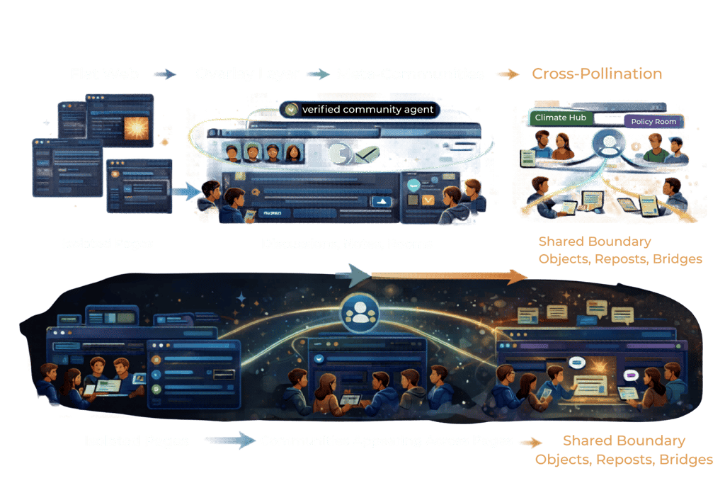 A meta‑community is a community that operates across the entire web rather than inside a single platform. Members interact directly on webpages through the Canopi overlay.